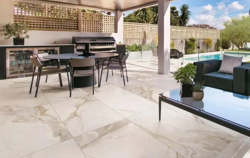 Имитации благородного камня часто используются в отделке просторных холлов, ванных комнат, гостиных, но гораздо реже – террас. Керамика с текстурой мрамора, особенно в кремовых тонах, способна наделить наружную зону природной эстетикой – изысканной и современной одновременно.