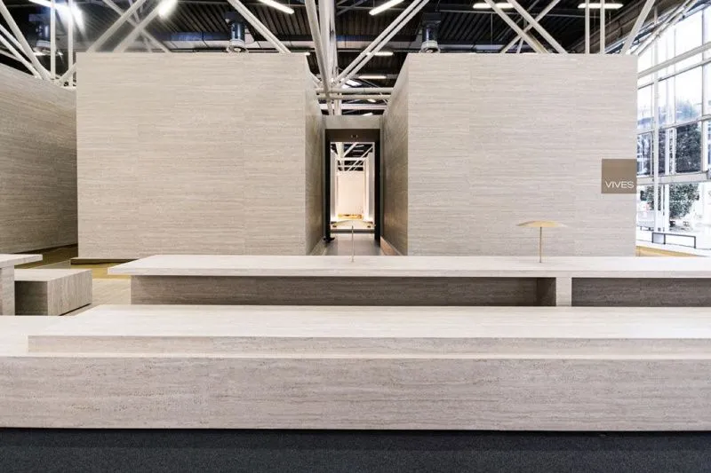 Стенд VIVES на выставке Cersaie 2023, облицованный с помощью множественных угловых соединений