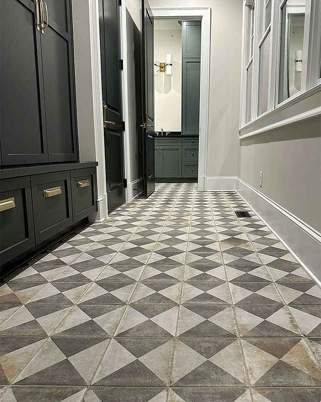 Благодаря оригинальной комбинации пол в прихожей выступил в качестве изысканной декорации, наделил ее ярким, неподвластным времени характером, сочетающим элегантность и универсальность.