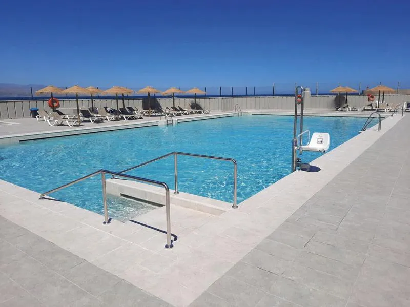 Коллекция экструдированного керамогранита Rocks компании Natucer была выбрана для отделки бассейна и прилегающей к нему территории. Модели белоснежного цвета создали в резервуаре эффект кристальной голубизны, параллельно обеспечив гигиеничность и легкость в уходе. В конструкциях лестниц использовались специальные элементы из этой же линейки, тогда как для обустройства зоны отдыха наилучшим вариантом стали изделия серого оттенка, обладающие противоскользящими свойствами, благодаря чему подступы к бассейну стали полностью безопасны.