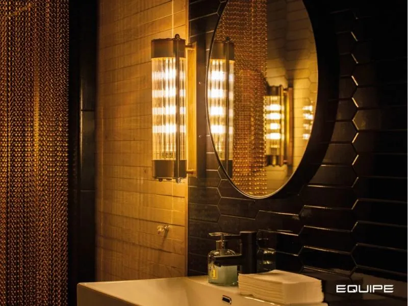 В туалетных комнатах все внимание привлекают контрасты предметов освещения и облицовочных материалов. Для пола выбран керамогранит STROMBOLI синего оттенка Bahia Blue, а для стен – плитка из белой глины серии ARROW двух цветов: кремовая гардения и черная.