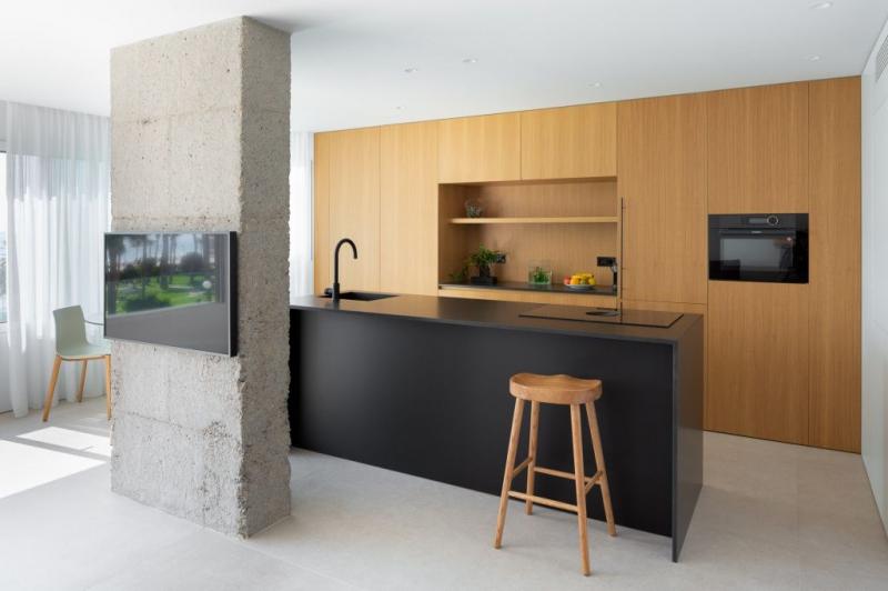 Актуальный и свежий вид интерьеру придают нейтральная палитра отделки и строгие линии предметов мебели, усиливающие общее очарование жилища. В этой же эстетике выдержаны и остальные составляющие, такие как дуб, столешницы из черного гранита – очень современные базовые материалы.